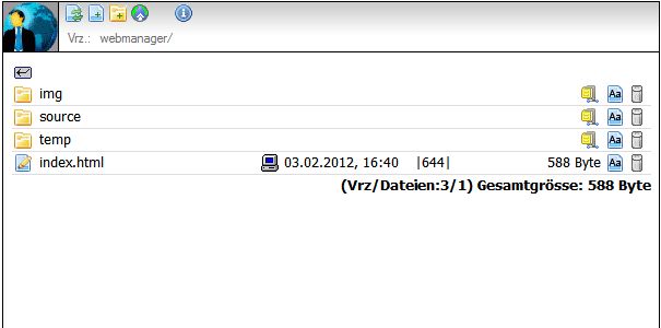 Eines meiner früheren Projekte ist der Webmanager. Die Software sollte die Verwaltung einfacher Dateioperationen auf dem Webspace vereinfachen. Ziel war es, mit wenigen Zeilen Scriptcode, einen Dateimanager auf PHP Basis auf dem Server zur Verfügung zu haben. FTP sollte nicht verwendet werden.